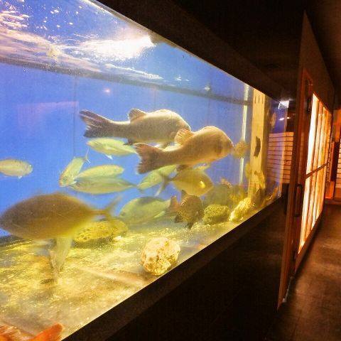 全長2.4メートルの大型生簀の中で泳ぐカワハギ、アジ、ヒラメなど季節によって旬の魚が元気に泳いでいます。